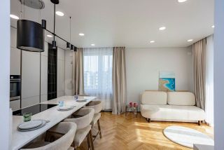 Hаши cветлые апартаменты оформлены в пастельных тонах с акцентом на натуральные материалы: паркет, эксклюзивные двери в полную высоту и лаконичная мебель создают атмосферу лёгкости и спокойствия.