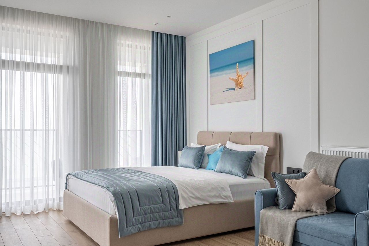 Большие окна открывают вид на море, а плотные шторы обеспечат тишину и уединение.