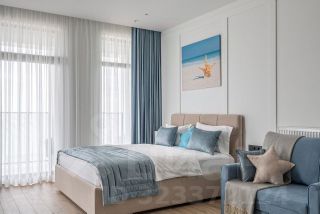 Интерьер выполнен в светлых и лазурных тонах с акцентом на свет и пространство.