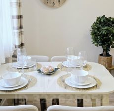 Кухня укомплектована всей необходимой для комфорта бытовой техникой: газовая плита, холодильник, посудомоечная машина, духовая и микроволновая печь, тостер, чайник.