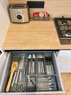 * Кухня-мечта с техникой Bosch (посудомоечная машина, кофеварка, чайник, тостер, микроволновая печь, духовой шкаф, вытяжка, большой холодильник) и всей необходимой посудой.