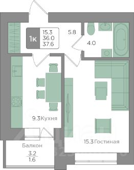 - кухня 9,7м² с выходом на лоджию 3,2м²