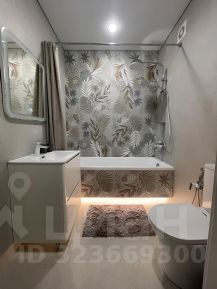 Кухня оборудована встроенной техникой: индукционной варочной поверхностью, духовым шкафом, микроволновой печью, посудомоечной машиной. На кухне также установлена стиральная машина и холодильник, есть электрический чайник, кастрюли, сковорода. Стол и мягкие стулья обеспечат комфорт и на кухне.