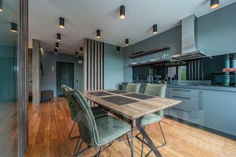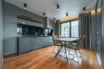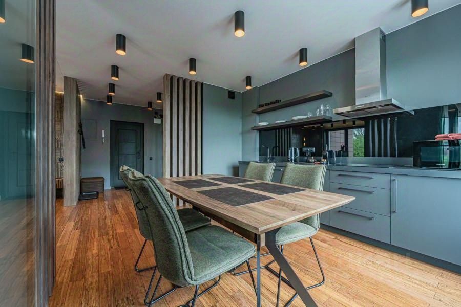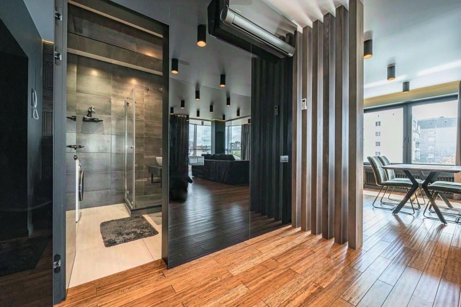 Деревянный паркетный пол, немецкие радиаторы и сантехнику Hansegrohe, Villeroy and Boh, каменные подоконники и деревянные панели, сделанная на заказ стеклянная стеновая панель и дверь позволяют назвать эту квартиру люксом. Панорамное остекление, посудомоечная машина, кондиционер, диван от ONE mebel сделают ваш отдых комфортным и не забываемым.