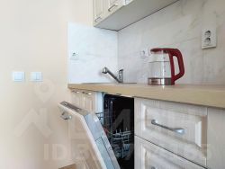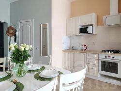 Полностью оборудованная кухня с микроволновкой, посудомоечной машиной, холодильником и всей необходимой посудой и столовыми приборами. В квартире также имеется два санузла, один из которых с душевой кабиной.