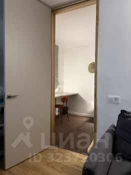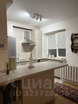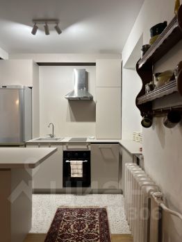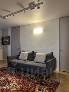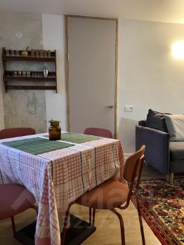 Квартира выполнена в современном стиле с советским декором, мебель и кухня выполнены на заказ, как и двери в потолок.