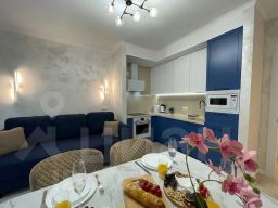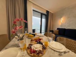 Из окон спальни и кухни-гостиной открывается вид на Балтийское море, имеется балкон с мебелью. В апартаментах есть двуспальная кровать и диван, оборудованная кухня с плитой, холодильником, микроволновой печью, посудомоечной машиной и посудой, ванная комната с душевой кабиной, стиральная машина, утюг и гладильная доска, тёплые полы, Wi-Fi и Smart TV. Размещение с животными возможно по предварительной договоренности за дополнительную плату.