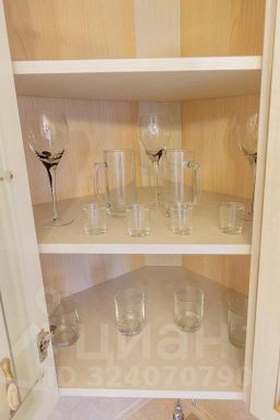 Из большой кухни (9,7 кв.м) можно выйти на застекленный балкон, который может служить уединенным местом отдыха и местом хранения хозяйственных средств, т.к. здесь установлен очень удобный шкаф.