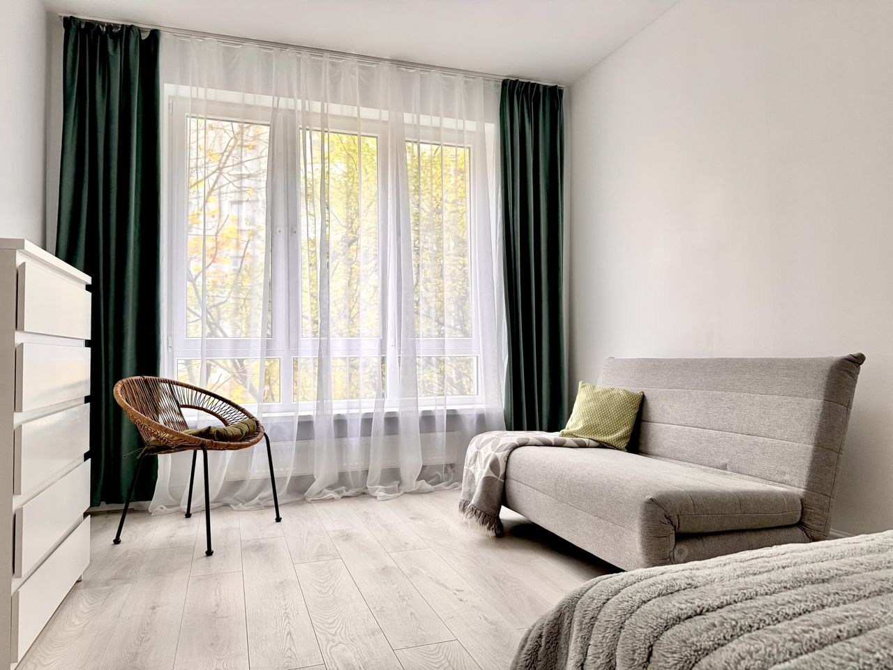 В квартире двуспальная кровать 140х200, с ортопедическим матрацем, раскладной диван 140х200.