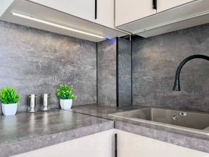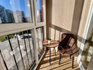 Квартира со свежим ремонтом и индивидуальным регулируемым отоплением имеет одну спальню, кухню, санузел, лоджию с панорамным остеклением.