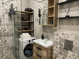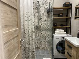 - Уютная ванная с душевой кабиной и дополнительно — стиральная и посудомоечная машины.