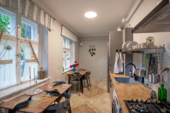 Общая кухня, расположенная на этаже, оборудована всей необходимой бытовой техникой и полным набором посуды, позволит вам готовить любимые блюда и станет идеальным местом для завтраков и романтических ужи