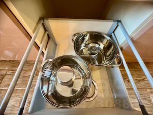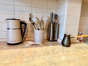 На кухне вы найдете все необходимое для приготовления еды: посуда, столовые приборы, кастрюли и сковородки, микроволновка, холодильник, чайник, духовка и газовая плита.