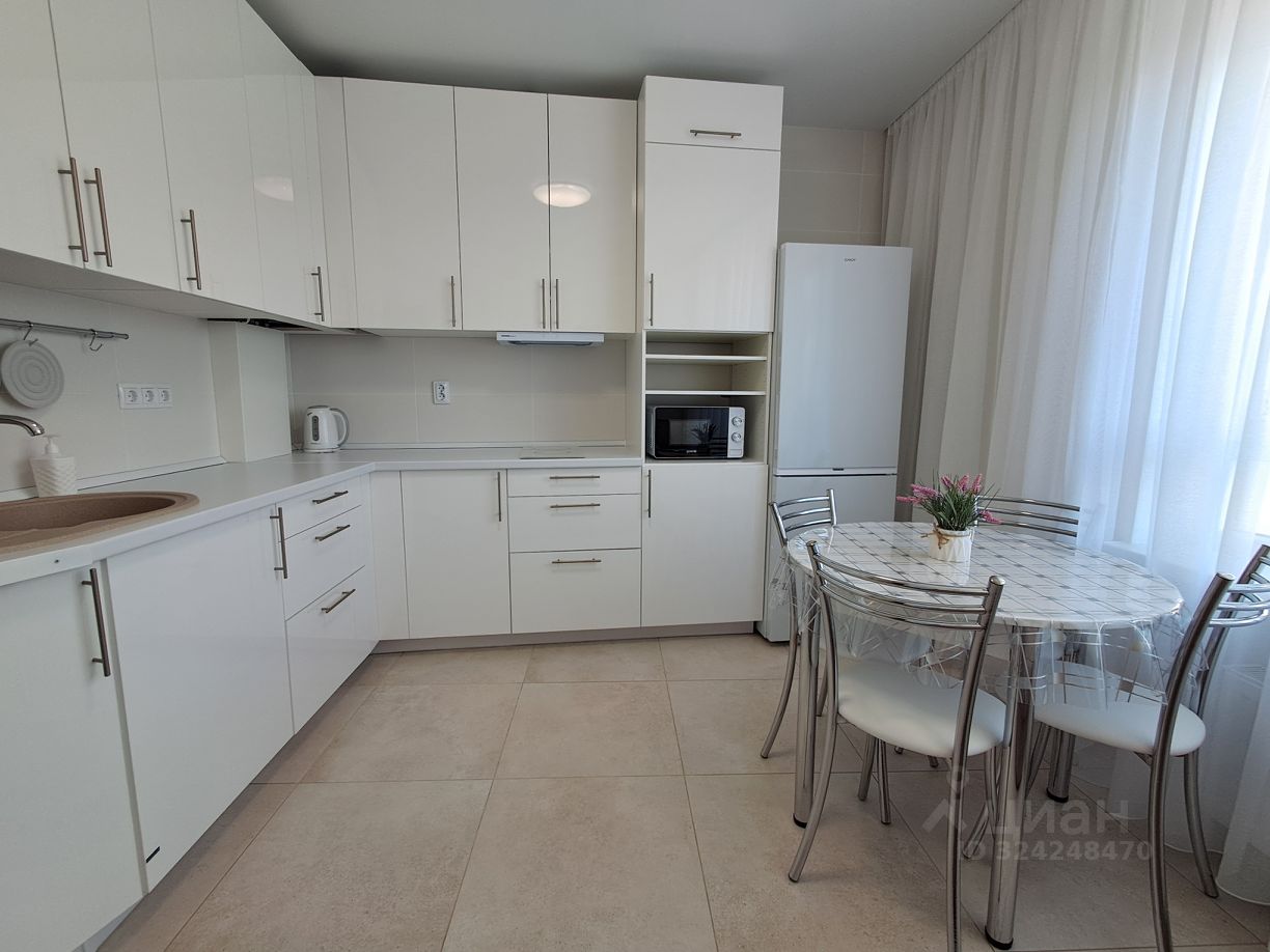 В квартире выполнен свежий евро ремонт, автономное отопление, подогрев полов. Просторная кухня оборудована необходимой бытовой техникой: варочная поверхность, вытяжка, большой холодильник, микроволновая печь, электрический чайник. Из мебели в кухне— вместительные шкафы, обеденный стол со стульями и удобный диван.