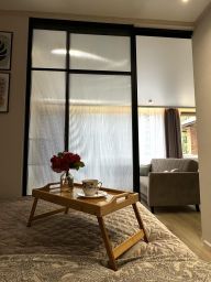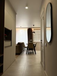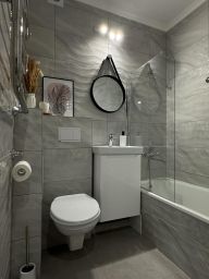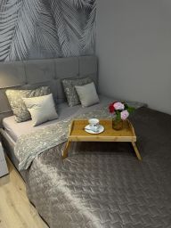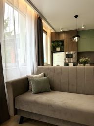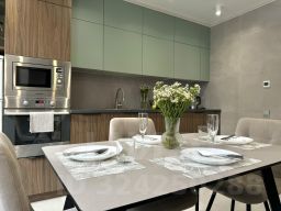 В квартире светлый и стильный дизайнерский ремонт, создающий атмосферу уюта и комфорта. Здесь есть все необходимое для приятного времяпрепровождения от бытовой техники до посуды и постельного белья. Спальные места представлены двуспальной кроватью и раскладным диваном.