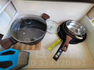 Посуда: сковородки, кастрюли, тарелки, чашки, стаканы и приборы.