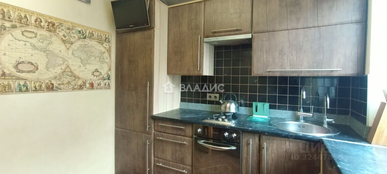Кухонная зона оборудована столешницей по периметру, что позволяет готовить с видом на город, есть всё необходимое для жизни (холодильник, плита, стиральная машина, стол, стулья).