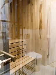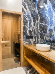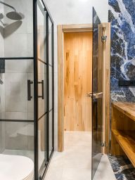 В квартире есть все, что нужно для комфортного проживания: двуспальная кровать, раскладной диван, постельное белье и полотенца, необходимая посуда, микроволновка, телевизор, Wi-Fi, фен, сауна. В общем холле есть кофе-машина, аптечка, утюг, гладильная доска и кулер с питьевой водой.