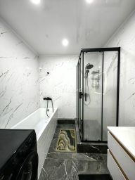 В каждой комнате есть спальное место. На лоджии есть подвесная сушилка для белья.Санузлы раздельные. При этом в ванной комнате есть и душевая кабинка и ванна. Также есть стиральная машинка.