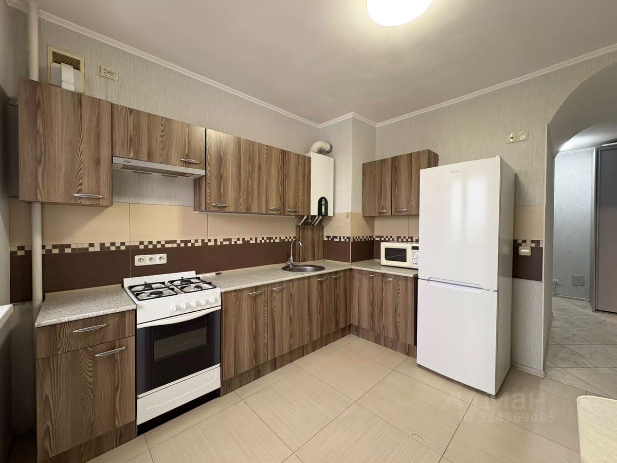 Кухня: встроенный кухонный гарнитур, холодильник, газовая варочная поверхность, духовой шкаф, микроволновая печь, обеденный стол + стулья.