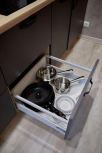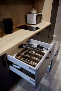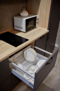 На кухне, есть все необходимое: посуда , салатники, кастрюли и сковороды, столовые приборы , стаканы, бокалы, фужеры