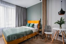 Студия с вместимостью до 2 гостей. В квартире есть все, что нужно для комфортного проживания: двуспальная кровать, постельное белье и полотенца, необходимая посуда, телевизор, Wi-Fi, холодильник, фен. В общем холле есть кофемашина с зерновым кофе, аптечка, утюг, гладильная доска и кулер с питьевой водой.