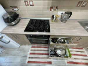 Квартира оснащена всем необходимым для комфортного проживания: 2 угловых раскладных дивана с ортопедическим основание, раскладное кресло на лоджии, комфортная современная кухня со встроенной техникой, полный комплект посуды, эл.чайник, микроволновая печь, мультиварка, чай и кофе. Автономное отопление,