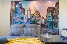 В апартаментах двуспальная кровать (180х200), кухня со всем необходимым (холодильник, плита, микроволновая печь, чайник, а так же посуда и приборы), остекленный балкон, стиральная машина, фен, утюг, гладильная доска, сушилка для одежды, телевизор и высокоскоростной Wi-Fi, шампунь, гель для душа, жидкое мыло, зубная паста, ватные палочки, ватные диски, стиральный порошок, чай, кофе, сахар, соль, масло.