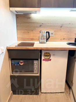 Кухонная зона оборудована необходимой посудой и бытовой техникой: холодильник, микроволновая печь, индукционная варочная панель, электрочайник.
