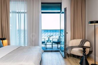Интерьер выстроен, как хорошо продуманная композиция: спокойные натуральные оттенки, мягкие линии, благородные фактуры. Спальня напоминает номер бутик-отеля — с идеальной кроватью, в которую хочется провалиться, и текстилем, похожим на прикосновение. Панорамные окна стирают границу между интерьером и горизонтом, а балкон становится личной ложей с видом на море — для утреннего кофе и вечерних мыслей.