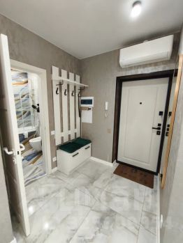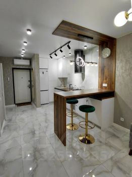 Современная евро-двухкомнатная квартира площадью 42 кв. метра, с новым ремонтом, кухней-гостиной, спальней и просторной ванной комнатой.
