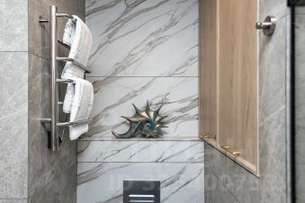 Интерьер выстроен, как хорошо продуманная композиция: спокойные натуральные оттенки, мягкие линии, благородные фактуры. Спальня напоминает номер бутик-отеля — с идеальной кроватью, в которую хочется провалиться, и текстилем, похожим на прикосновение. Панорамные окна стирают границу между интерьером и горизонтом, а балкон становится личной ложей с видом на море — для утреннего кофе и вечерних мыслей.