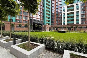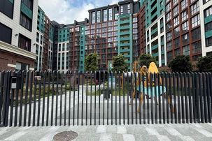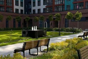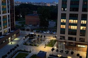 Во дворе зеленая зона с фонтаном и детская площадка.