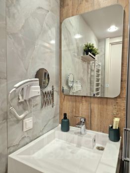 В коридоре и душевой есть теплые полы, установлен гигиенический душ. Есть полный комплект гигиенических принадлежностей.