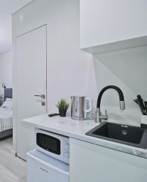 В каждой студии есть мини кухня, оборудованная холодильником, плитой индукционная, микроволновкой, электрическим чайником, небольшим набором посуды, а также в каждой студии есть санузел с душем и туалетом, умывальник, фен, полотенца, туалетные принадлежности. Из окна виден парк и историческое здание университета построенное 1844 году.