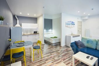 Уютная современная студия с двуспальной кроватью, гостиной зоной, полностью оборудованной мини-кухней и отдельным входом.
