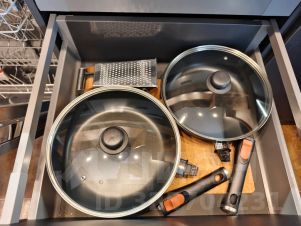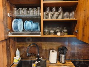 Обустроенная кухня со всем необходимым инвентарем и столовыми приборами