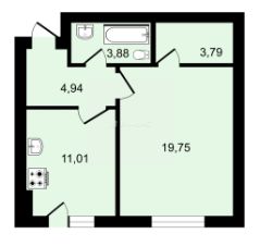 общая площадь квартиры 43,7 м.кв, комнаты 19,75 м.кв, кухня 11,01 м.кв, с/у совмещенный 3,88 м.кв.коридор 4,94 м.кв.гардеробная 3,71 м.кв.