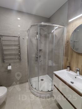Санузел совмещенный, с душевой кабиной, стильной сантехникой и стиральной машиной.
