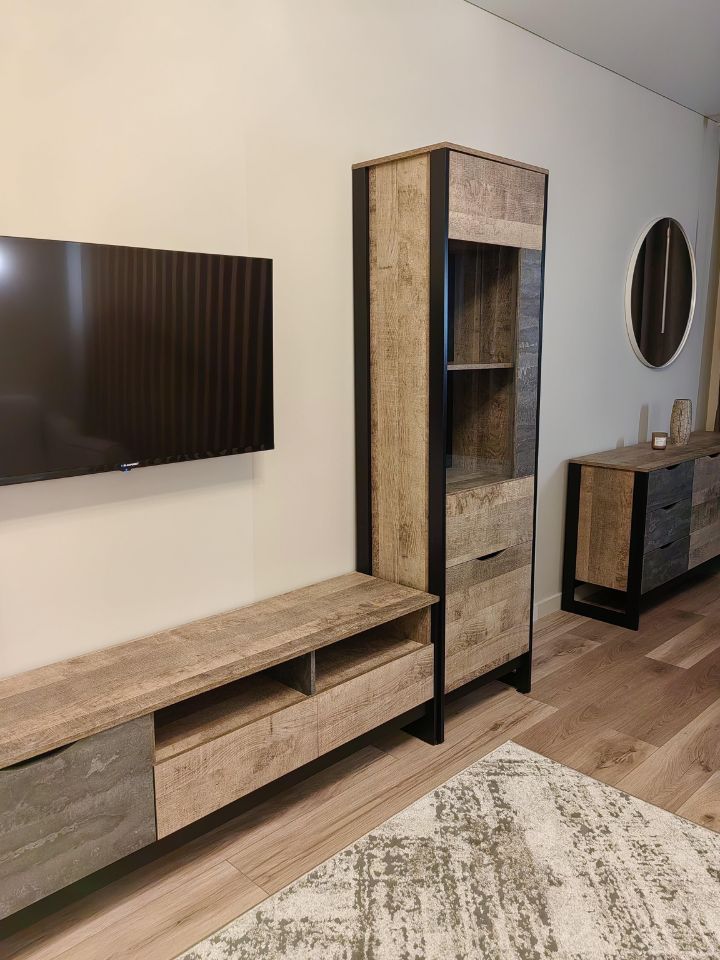В квартире выполнен дизайнерский ремонт. Просторная гостиная оборудована диваном и телевизором с цифровым ТВ. За перегородкой расположена двухспальная кровать с ортопедическим матрасом. Спальные принадлежности (подушки, одеяло, постельное бельё и полотенца) предоставляются.
