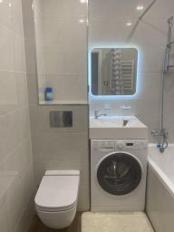 Квартира для 2 гостей. Спальные места: двуспальная кровать. Квартира с современным ремонтом, оборудована всей необходимой мебелью и техникой: телевизор, плита, духовка, микроволновая печь, стиральная машина, посудомоечная машинка, холодильник, а также посуда, постельное белье, полотенца, утюг, гладильная доска. Так же имеется удобное рабочее место, стол и кожаное кресло.