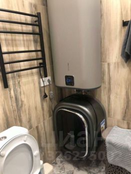 В ванной комнате стиральная машина, утюг и фен.