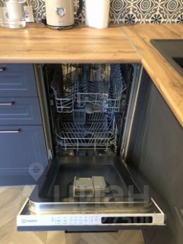 Полностью оборудованная кухня с плитой, микроволновкой, чайником, посудомоечной машиной и холодильником.