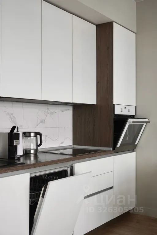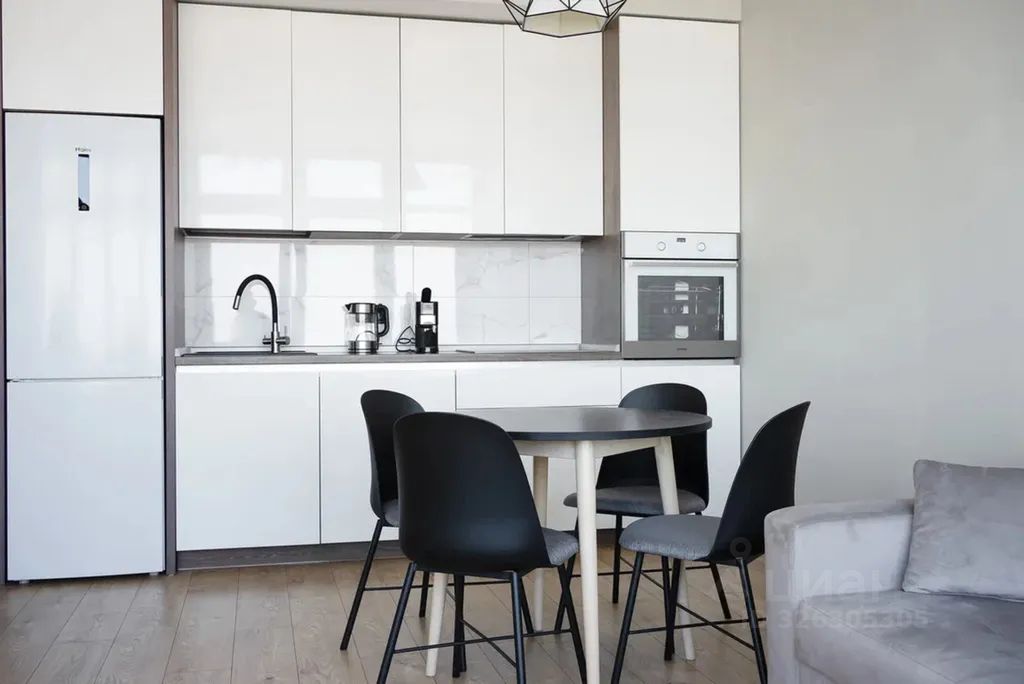 Полностью оборудованная кухня-гостиная со всем необходимым для жизни: холодильник с морозилкой, индукционная плита, вытяжка, духовой шкаф, электрический чайник, установлен фильтр для питьевой воды, посудомоечная машина, кофемашина, посуда, приборы, бокалы для вина, большой обеденный стол, зона отдыха