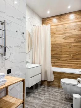 Просторный санузел с ванной: ванна, средства личной гигиены, фен Dyson для волос, набор полотенец