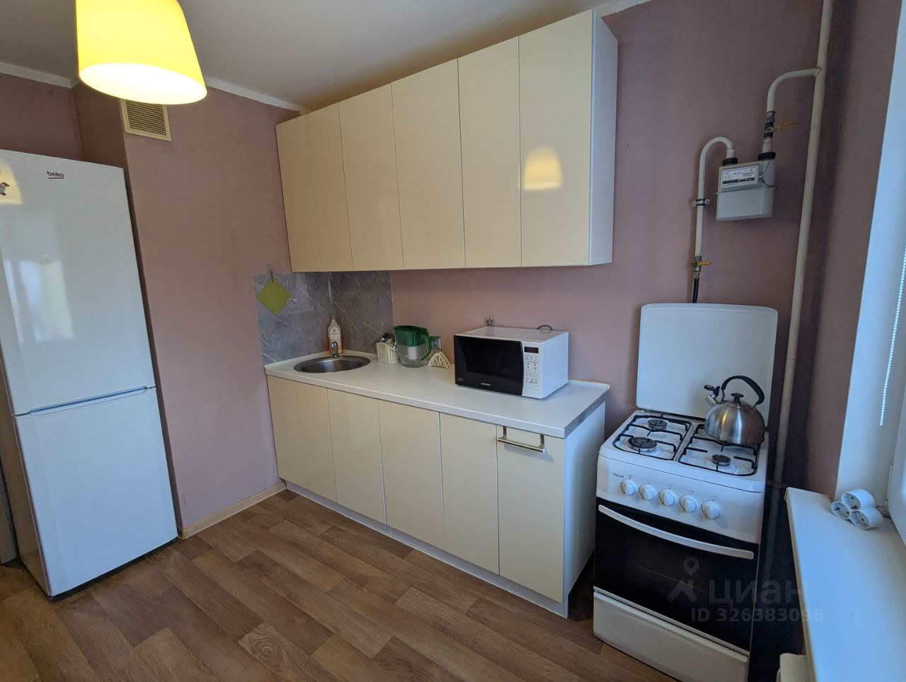 Кухня: Современный кухонный гарнитур, газовая плита, двухкамерный холодильник, микроволновая печь.