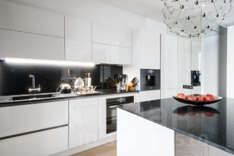 Полноcтью оборудованная кухня-гостиная: холодильник, плита, вытяжка, духовой шкаф, кофемашина , чайник, фен, фильтр для воды, посудомоечная машина, посуда, приборы, бокалы, стиральная машина .