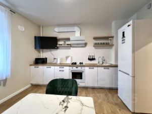 Кухня обустроена встроенной мебелью и современной техникой: холодильник, встраиваемая микроволновая печь, вытяжная система, газовая варочная поверхность, электрический духовой шкаф. также имеются стиральная машина, пылесос, два телевизора, утюг и прочее.