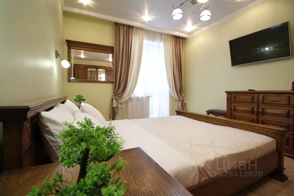 Спальня изолированная: двухспальная кровать 160/200, постельное белье, шкаф, комод, ТВ, балкон.