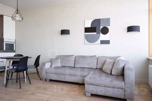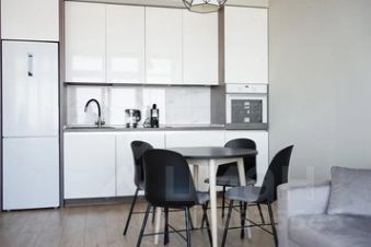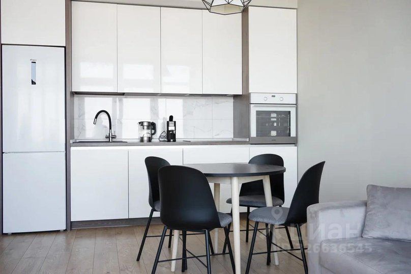Полностью оборудованная кухня-гостиная со всем необходимым для жизни: холодильник с морозилкой, индукционная плита, вытяжка, духовой шкаф, электрический чайник, установлен фильтр для питьевой воды, посудомоечная машина, кофемашина, посуда, приборы, бокалы для вина, большой обеденный стол, зона отдыха
